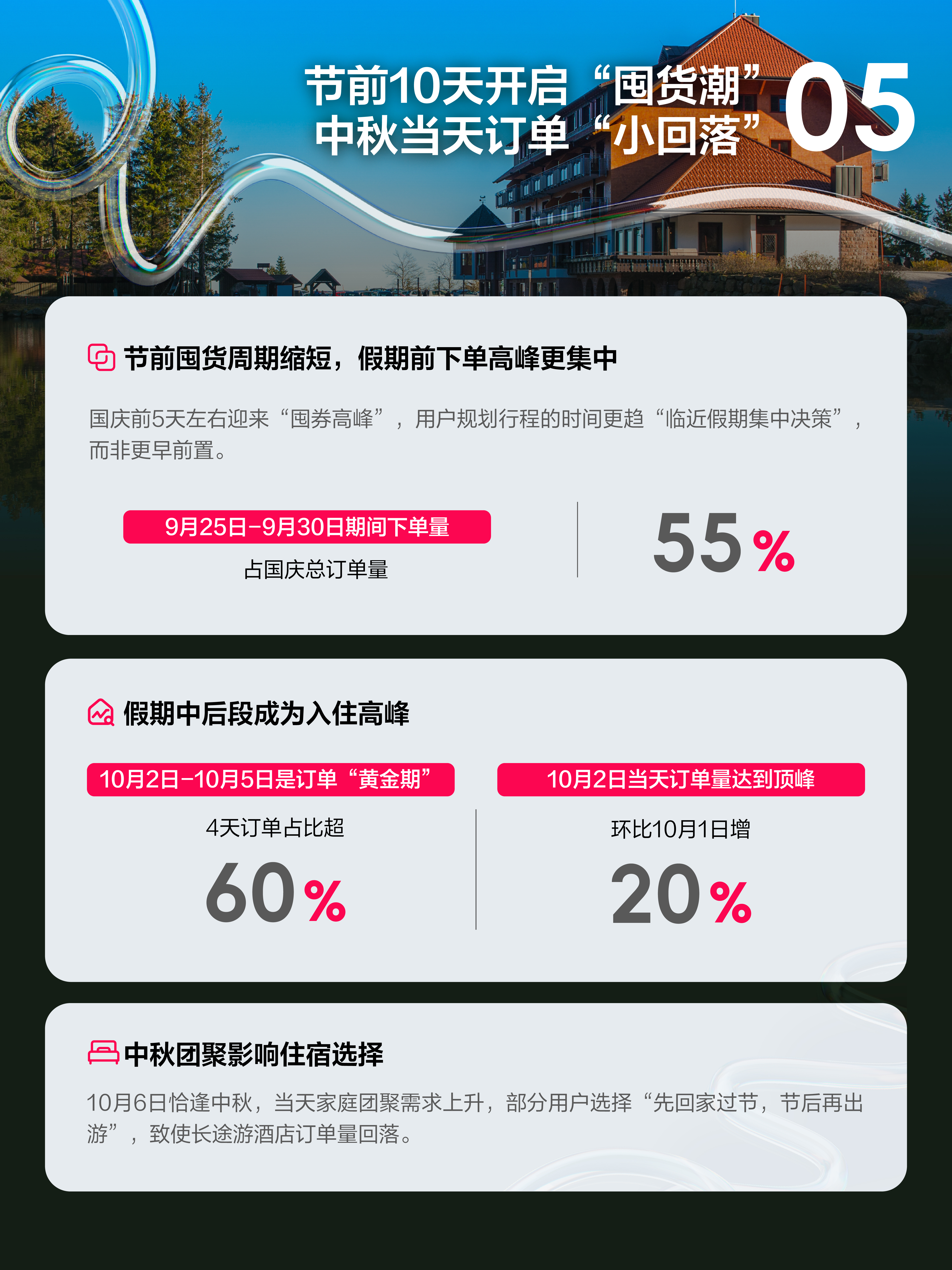 而在假期中后段,10月2日至10月5日出现订单“黄金期”,4天的订单占比超过60%,入住达到高峰。其中,10月2日当天订单量达到顶峰,环比10月1日增长20%。