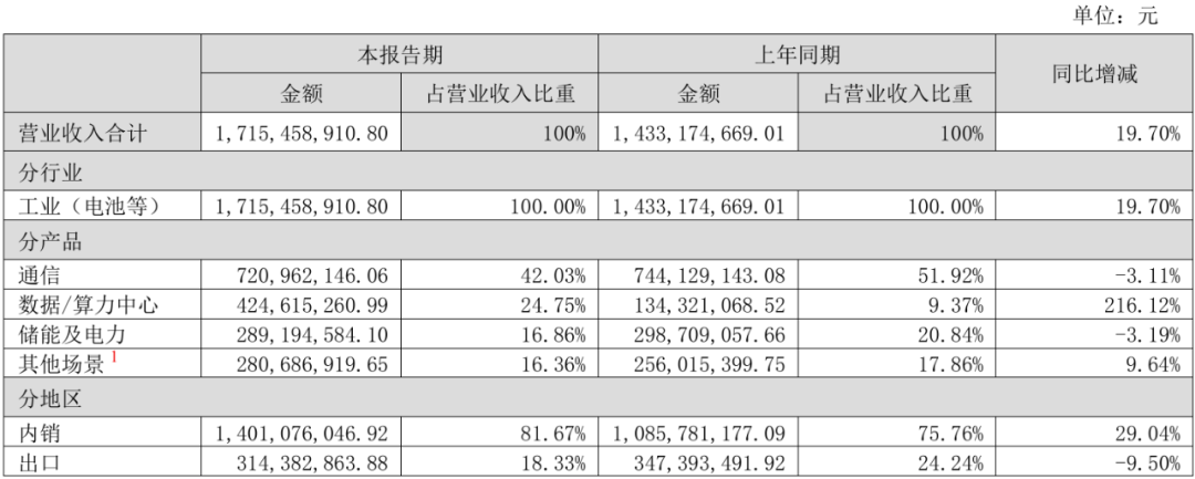 上图为今年半年报披露的产品分类,包括通信、数据/算力中心、储能及电力、其他场景4种,其中其他场景主要包括不间断电源、废旧电池、材料等。