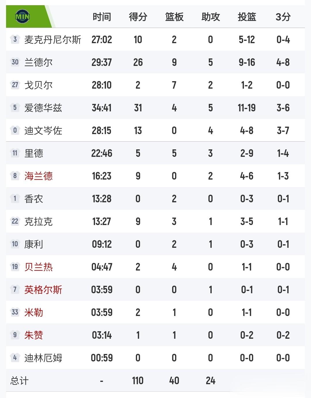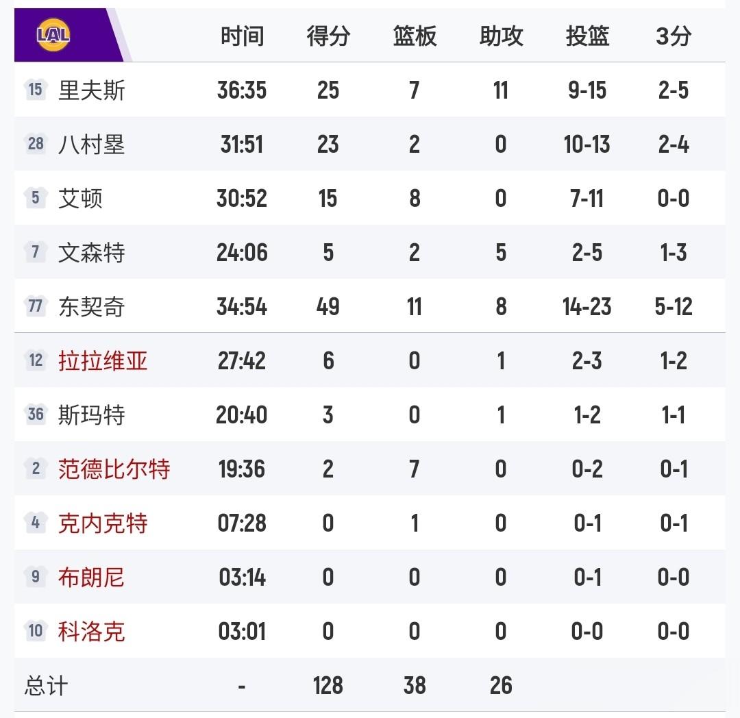 其中湖人队与森林狼比赛中,湖人队东契奇第一节得到23分,全场23投14中得到49分11篮板8助攻;森林狼队爱德华兹19投11中得到31分4篮板5助攻。