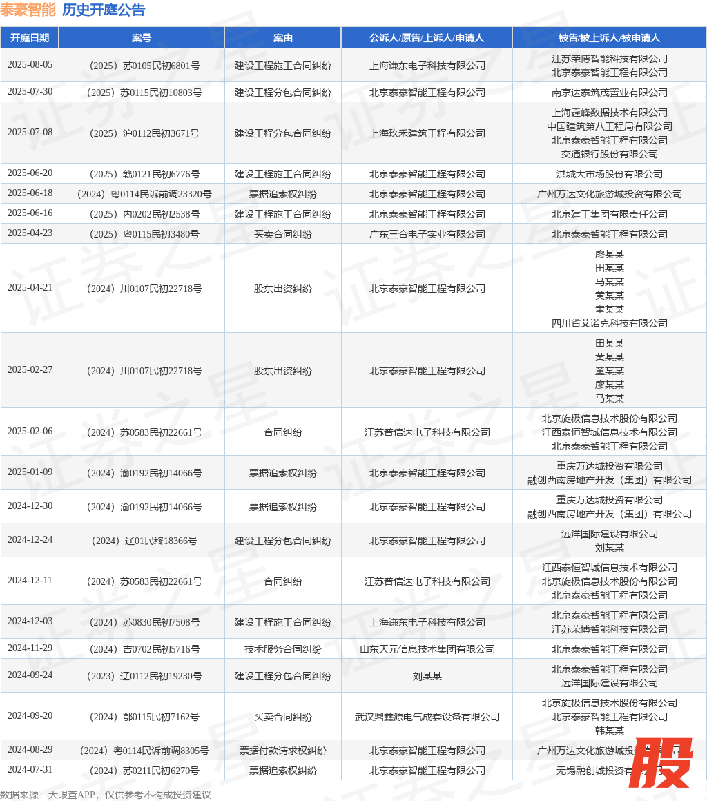 案号:(2025)赣0121民初6776号审理法院:南昌县人民法院案由:建设工程施工合同纠纷当事人信息: 原告/上诉人:北京泰豪智能工程有限公司 被告/被上诉人:洪城大市场股份有限公司开庭日期:2025年6月20日根据统计,近一年内以北京泰豪智能工程有限公司为当事人的历史开庭公告有26则,其中案由为“建设工程分包合同纠纷”的公告以5则居首,其次为“票据纠纷”有5则,“建设工程施工合同纠纷”有4则。历史开庭公告(前20条)如下: